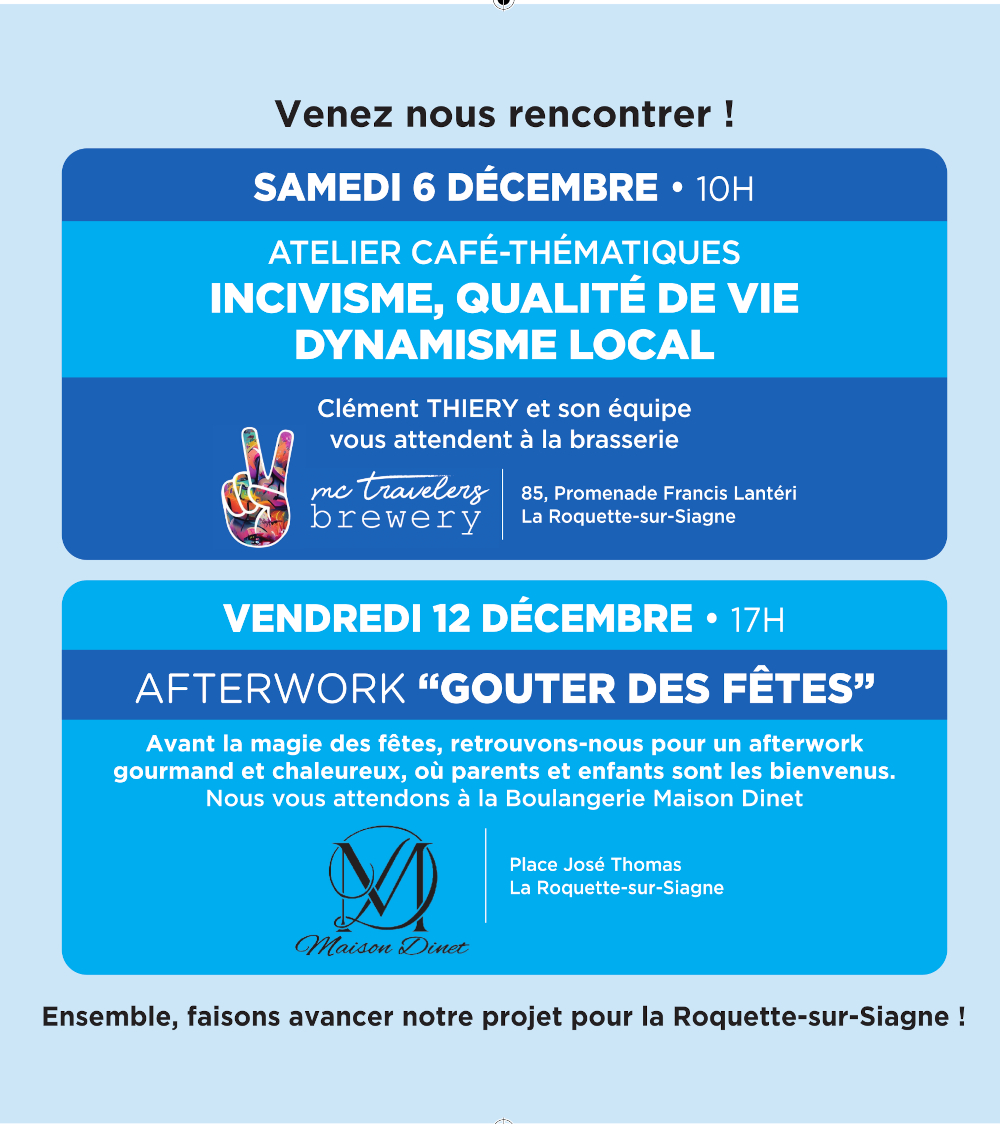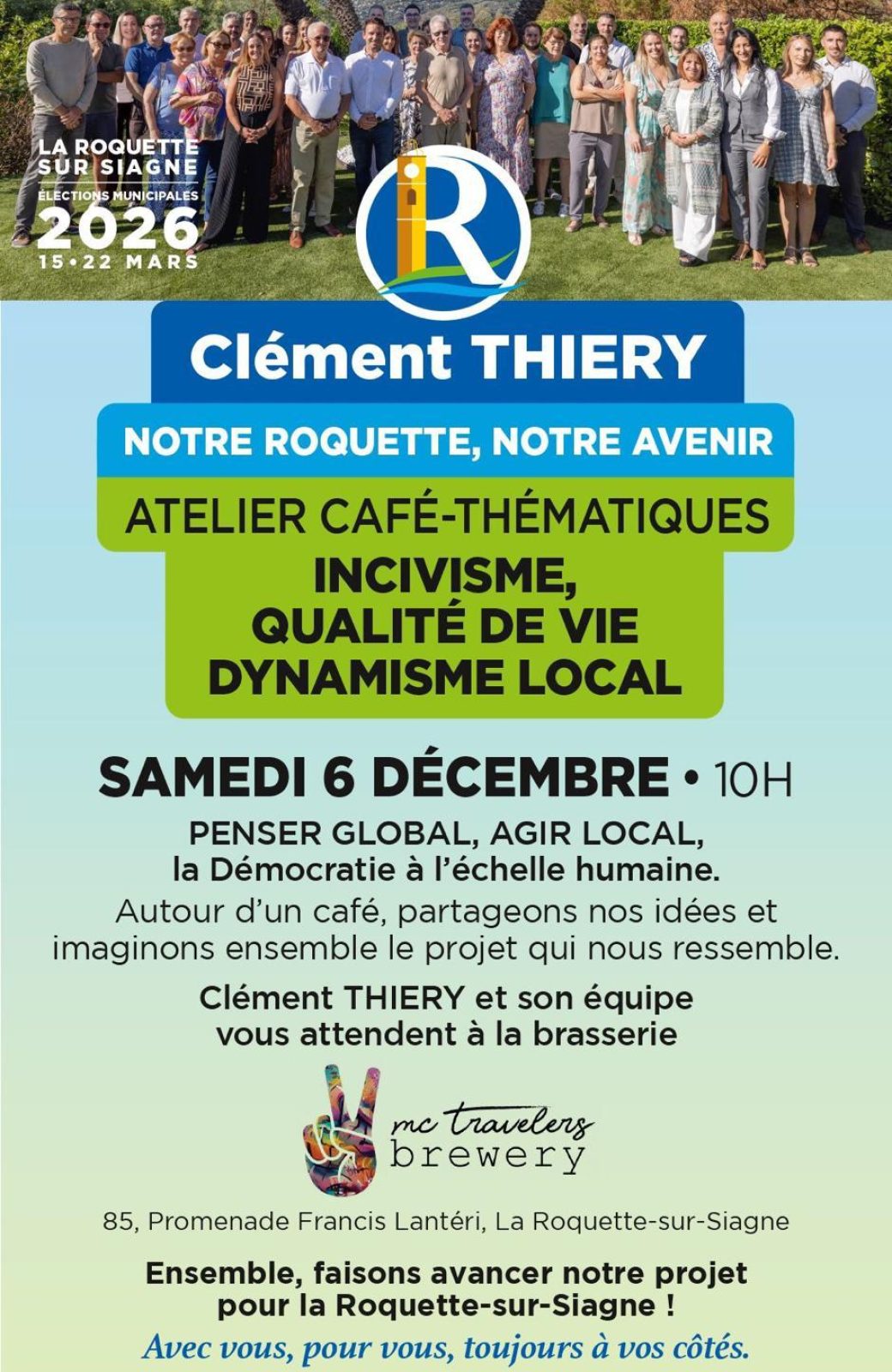 Clément THIERY vous donne rendez-vous chez Mc Travelers Brewery, place Saint-Georges au village de La Roquette-sur-Siagne, pour vous inviter à rejoindre notre démarche citoyenne.