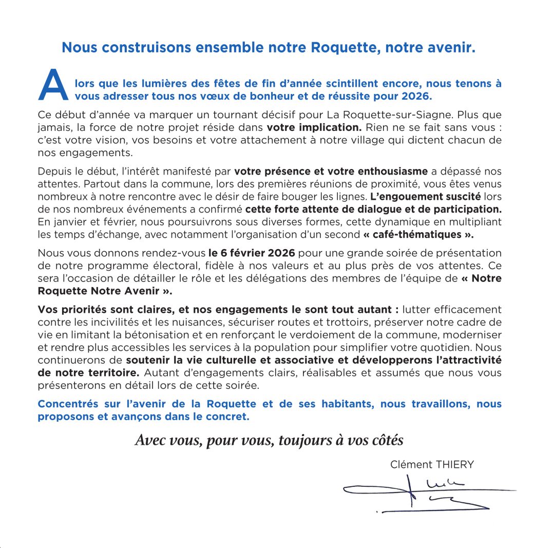La Roquette-sur-Siagne, élections municipales 2026, Clément Thiery, Notre Roquette Notre Avenir, réunion publique, soirée de campagne, engagement local, projets municipaux, équipe municipale, participation citoyenne, démocratie locale, avenir de la Roquette